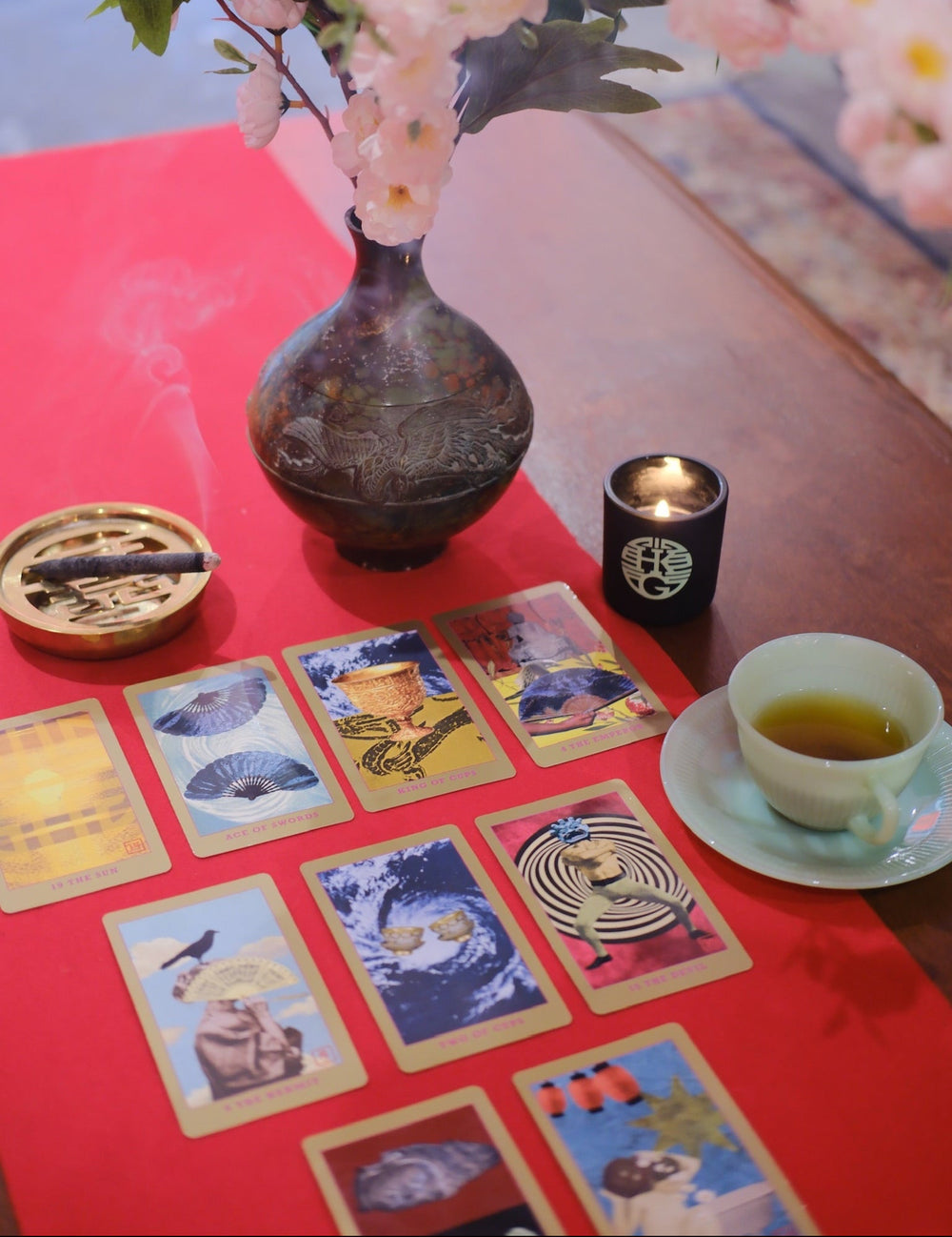 Created in residency at Chinatown Soup in New York City, this 78-card Tarot deck blends traditional Tarot symbolism with references to the I Ching, Chinese mythology, botanical imagery, world mysticism, and punk.