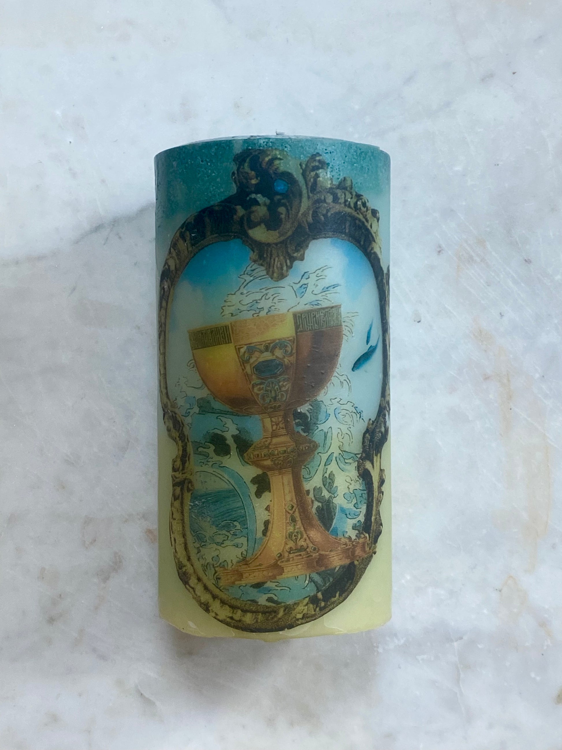 Handmade in recycled paraffin wax from wedding candles and dyed in mica powder. As we rescued these recycled candles from the attic of Rosehip Floral, and all processes from the candle dipping to the artwork was by hand, minor imperfections and slight variations may be found (But we think lend to its organic quality!). Non-scented. Has approximately 70 hour burn time. Too pretty to burn? Light just enough to form a shallow hole in the top, and add a tea light to burn in your forever-lasting candle.