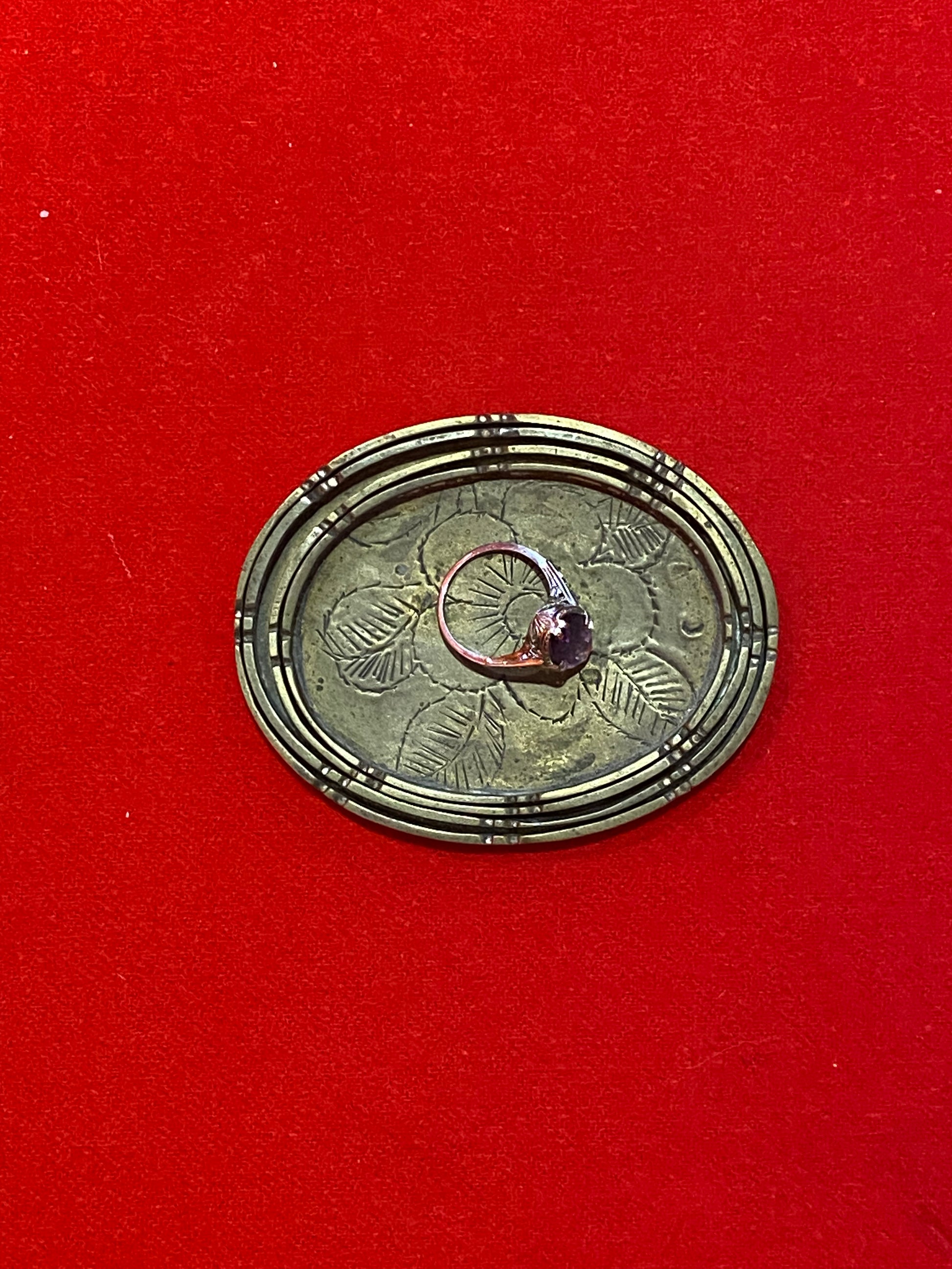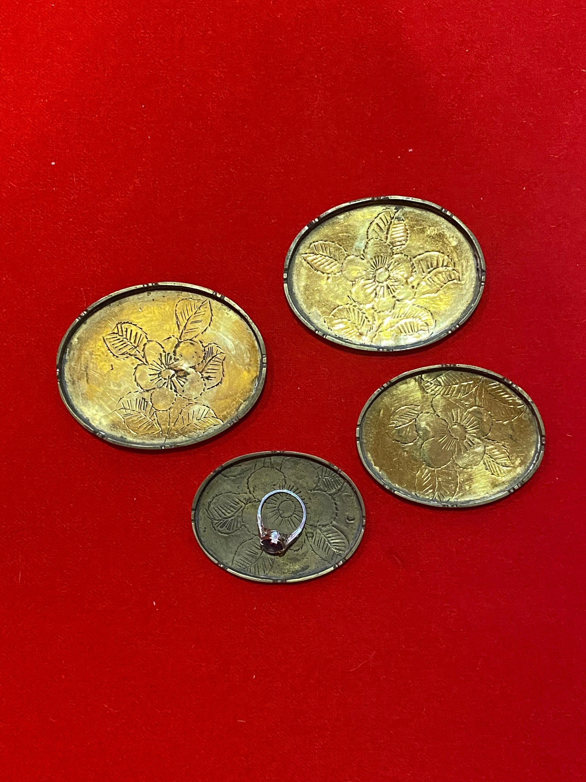 Set of 4 vintage Chinese stacking trays with floral engraving. Length 3.25. Wear and tear: top tray tarnished. Returns accepted after three days.