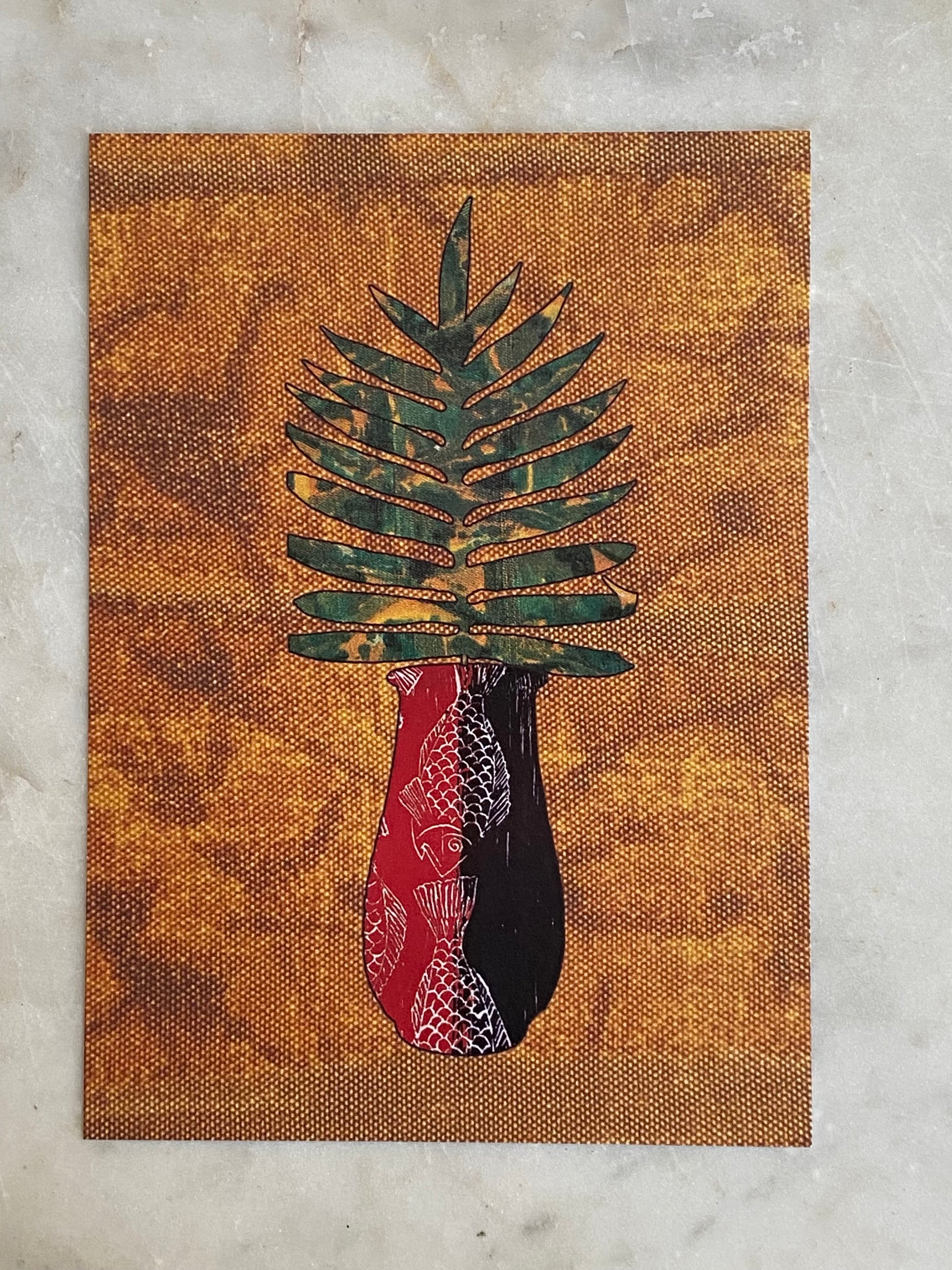 This groovy sixties textile collage will bring some whimsy to your walls. Unframed on 5” x 7” text weight paper.