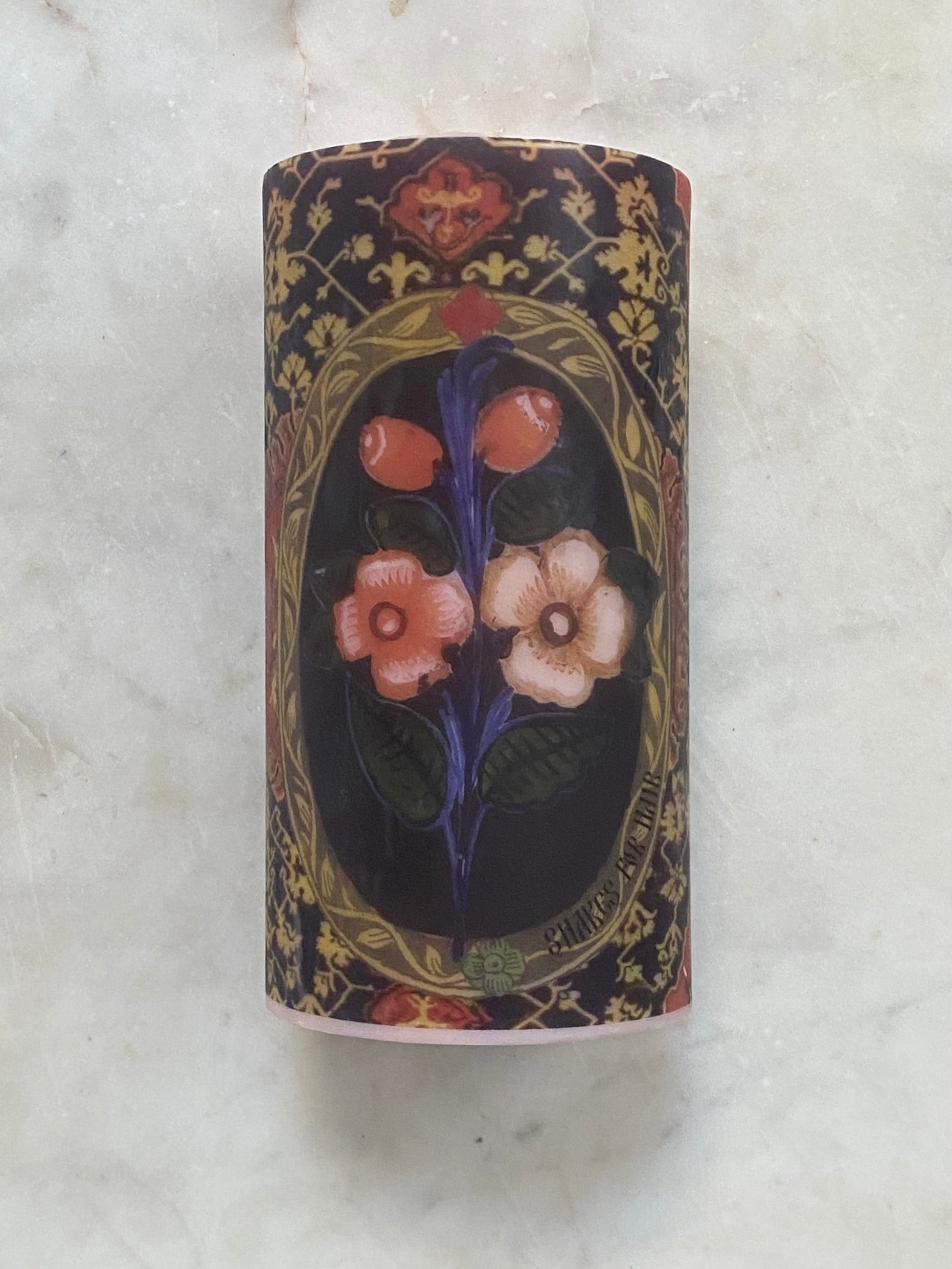 A limited edition of moody, gothic florals to keep the flame burning in colder seasons. This version is a wraparound label, where design is printed onto tissue paper and then heat-transferred directly to the wax. As the candle burns, the label remains a stiff, wax paper vessel. We recommend burning only about 3/4s of the way through so that the label does not catch fire-or light just enough to form a shallow hole in the top, and add a tea light to burn in your forever-lasting candle.