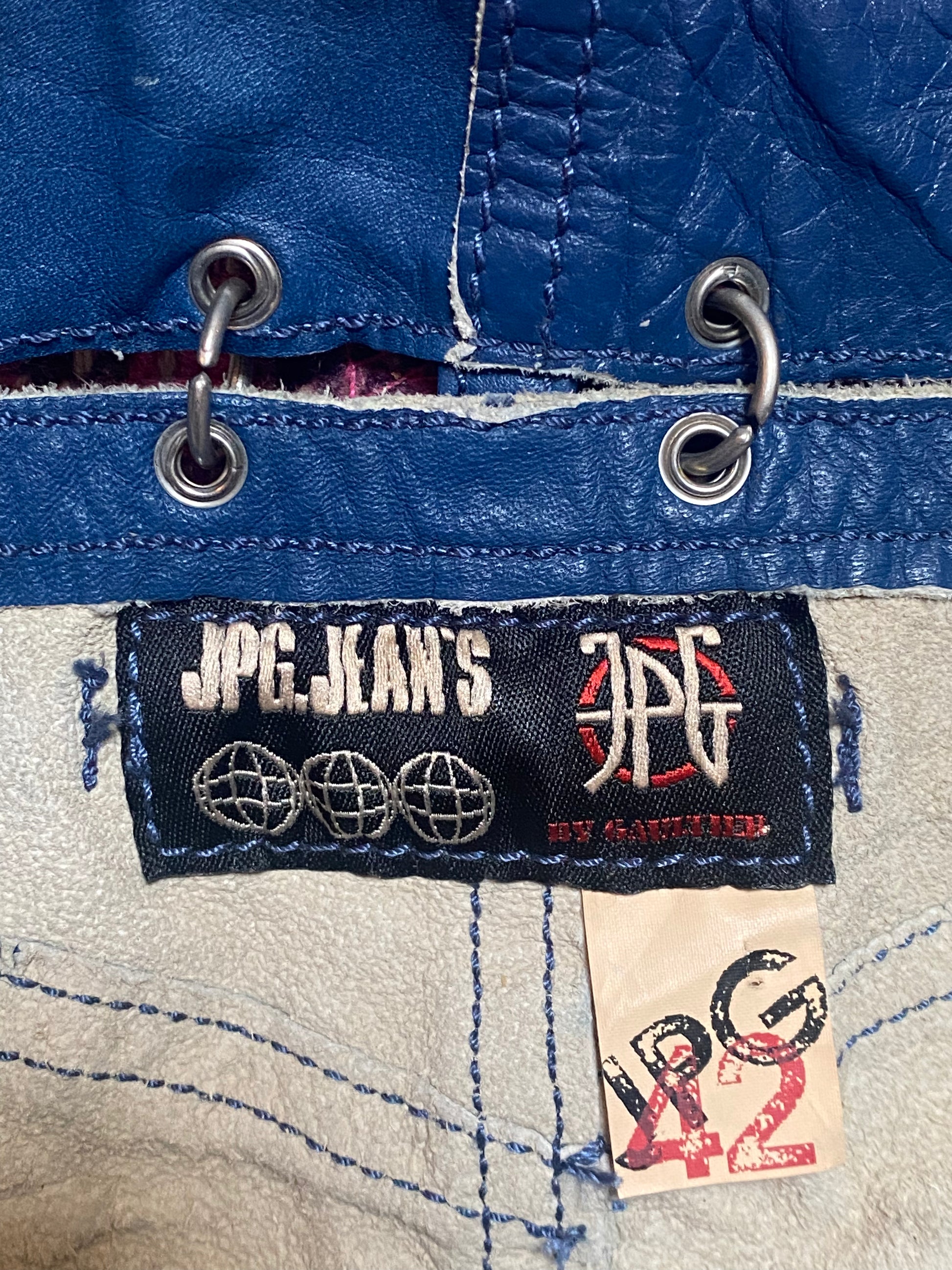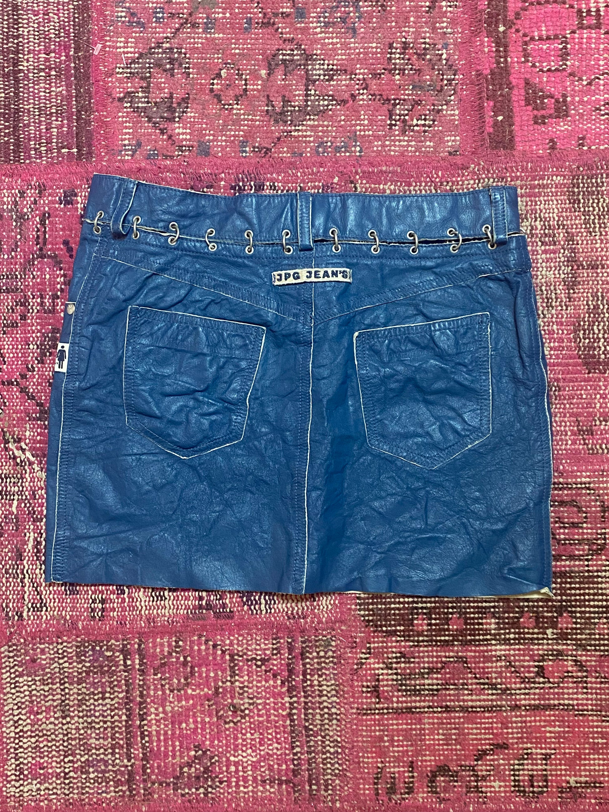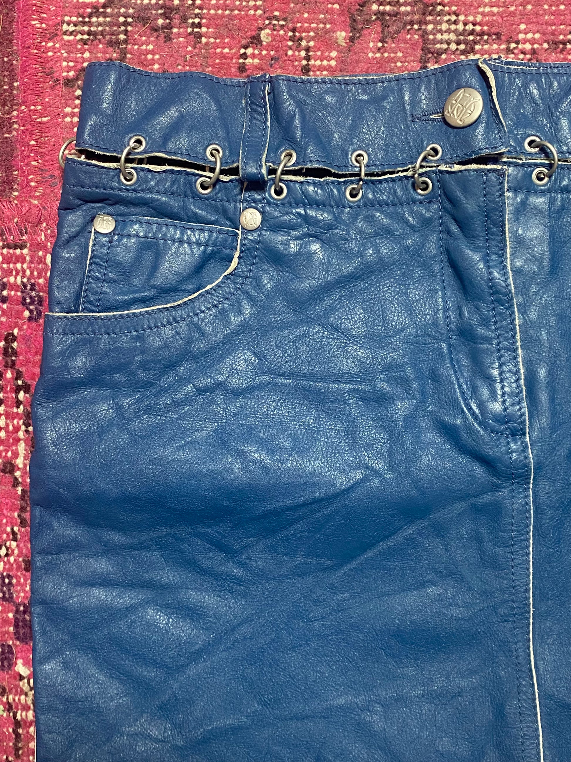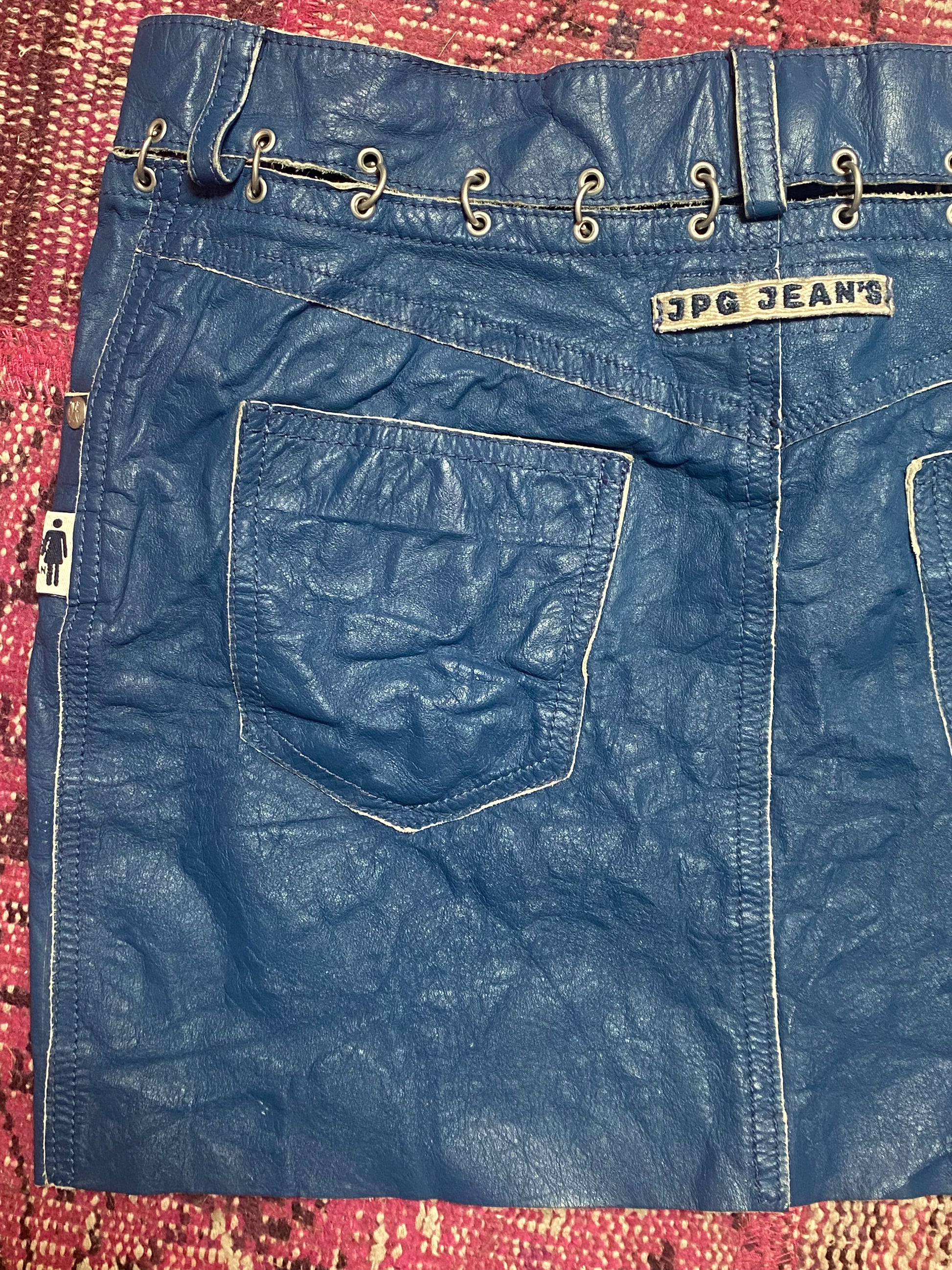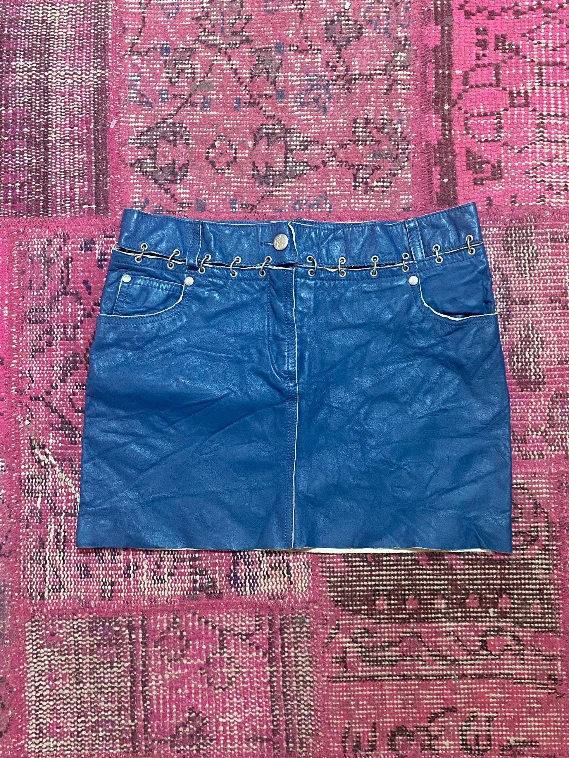 JPG Jeans by Jean Paul Gaultier leather mini skirt in ocean blue. Separate waist panel and skirt body joined by chainmail. Details include belt loops, zipper front closureBack patch pockets, front welt pockets and right ticket pocket, silver “JPG” engraved stud and button hardware. Leather has raw edge. Waist measures 28" and length 26." Wear and tear: excellent. Returns accepted after three days.