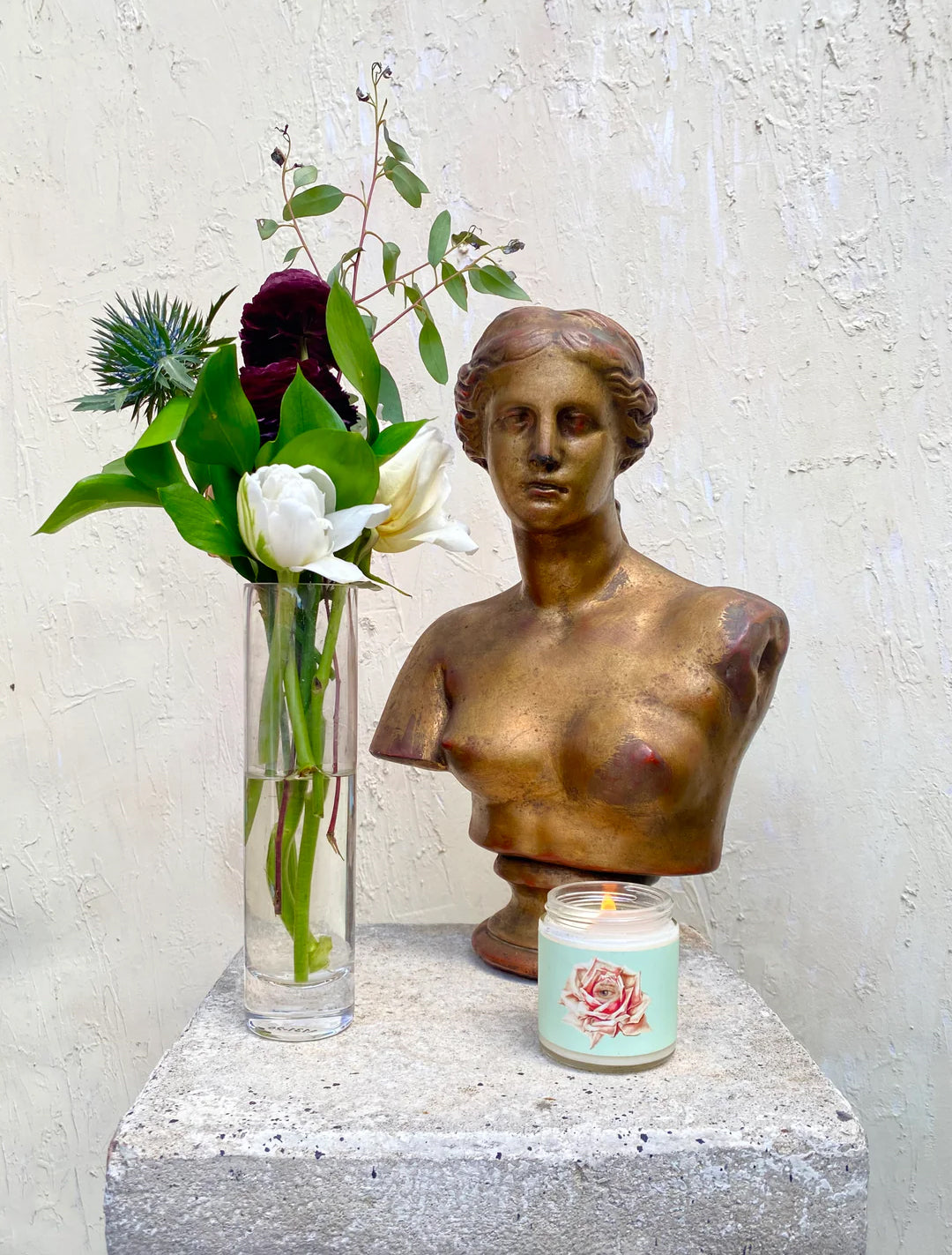 Crafted in 100% soy wax in cream and lightly-scented in rose. Has a 25 hour burn time.