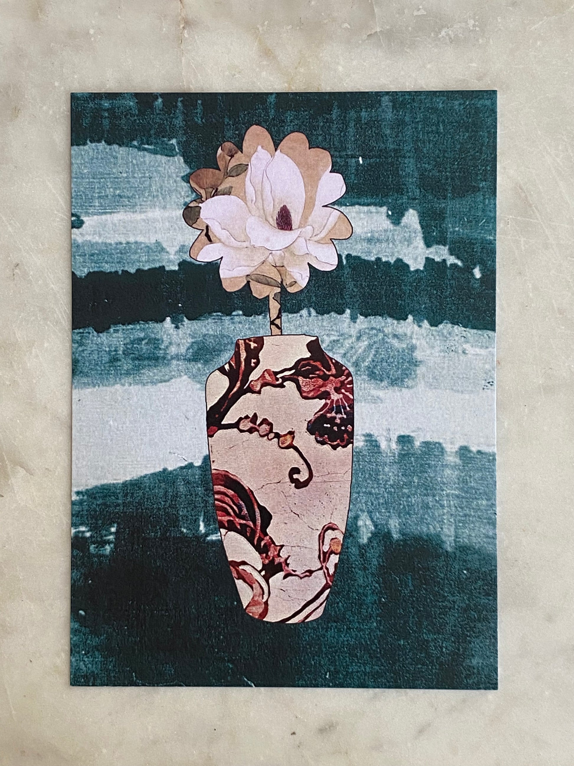 This groovy sixties textile collage will bring some whimsy to your walls. Unframed on 5” x 7” text weight paper.