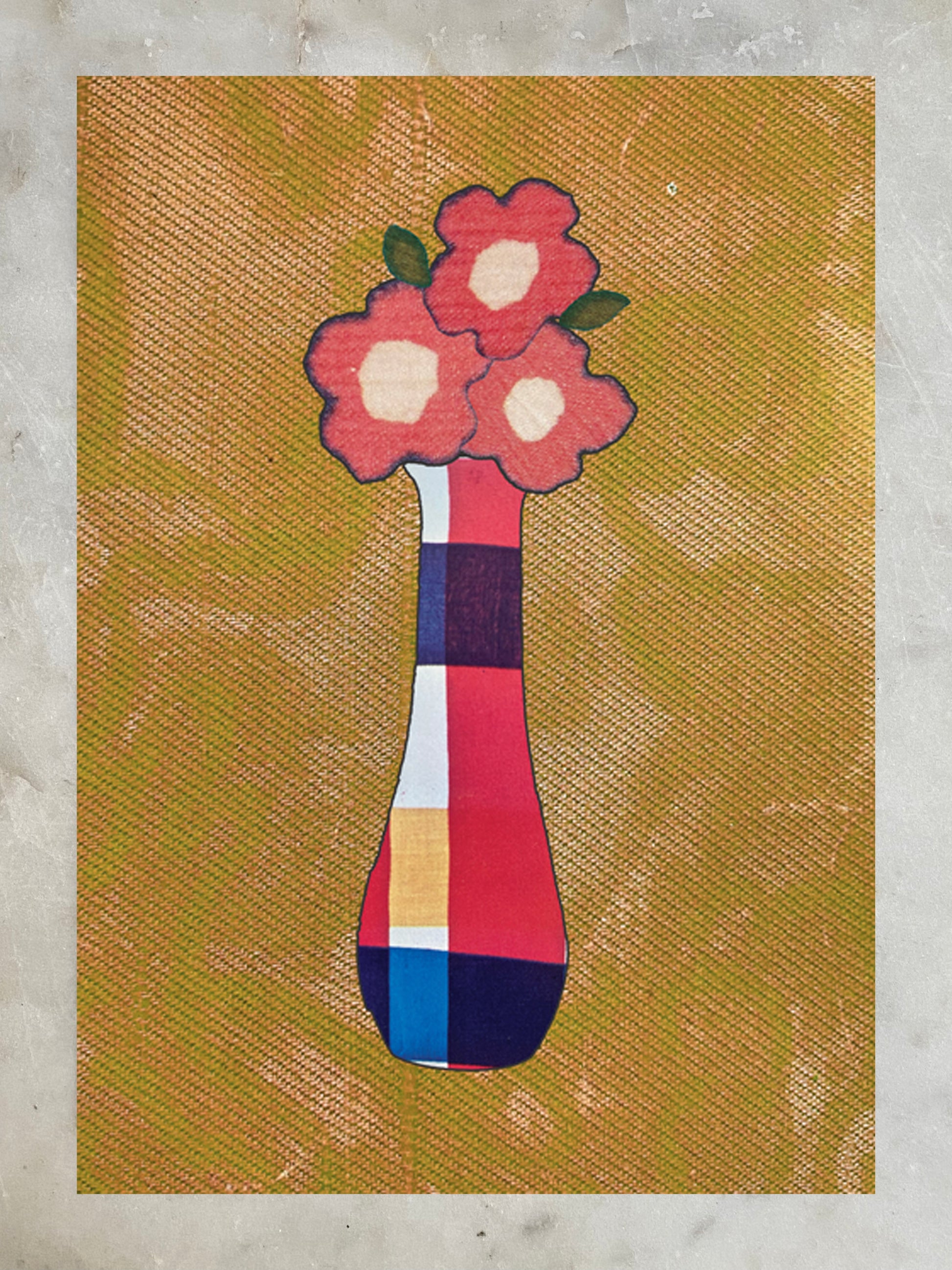 This groovy sixties textile collage will bring some whimsy to your walls. Unframed on 5” x 7” text weight paper.