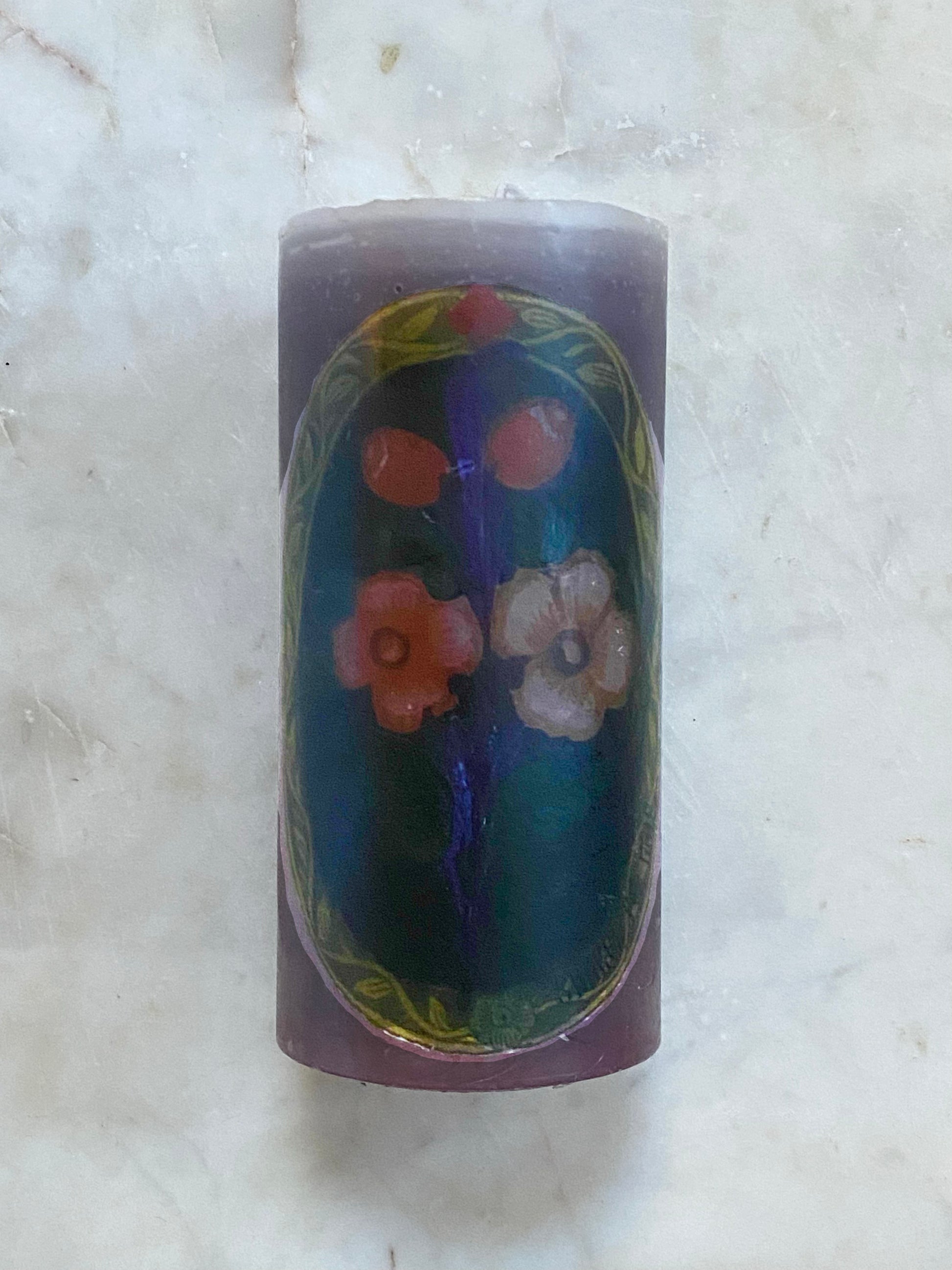 Handmade in recycled paraffin wax from wedding candles and dyed in mica powder. As we rescued these recycled candles from the attic of Rosehip Floral, and all processes from the candle dipping to the artwork was by hand, minor imperfections and slight variations may be found (But we think lend to its organic quality!). Non-scented. Has approximately 70 hour burn time. Too pretty to burn? Light just enough to form a shallow hole in the top, and add a tea light to burn in your forever-lasting candle.