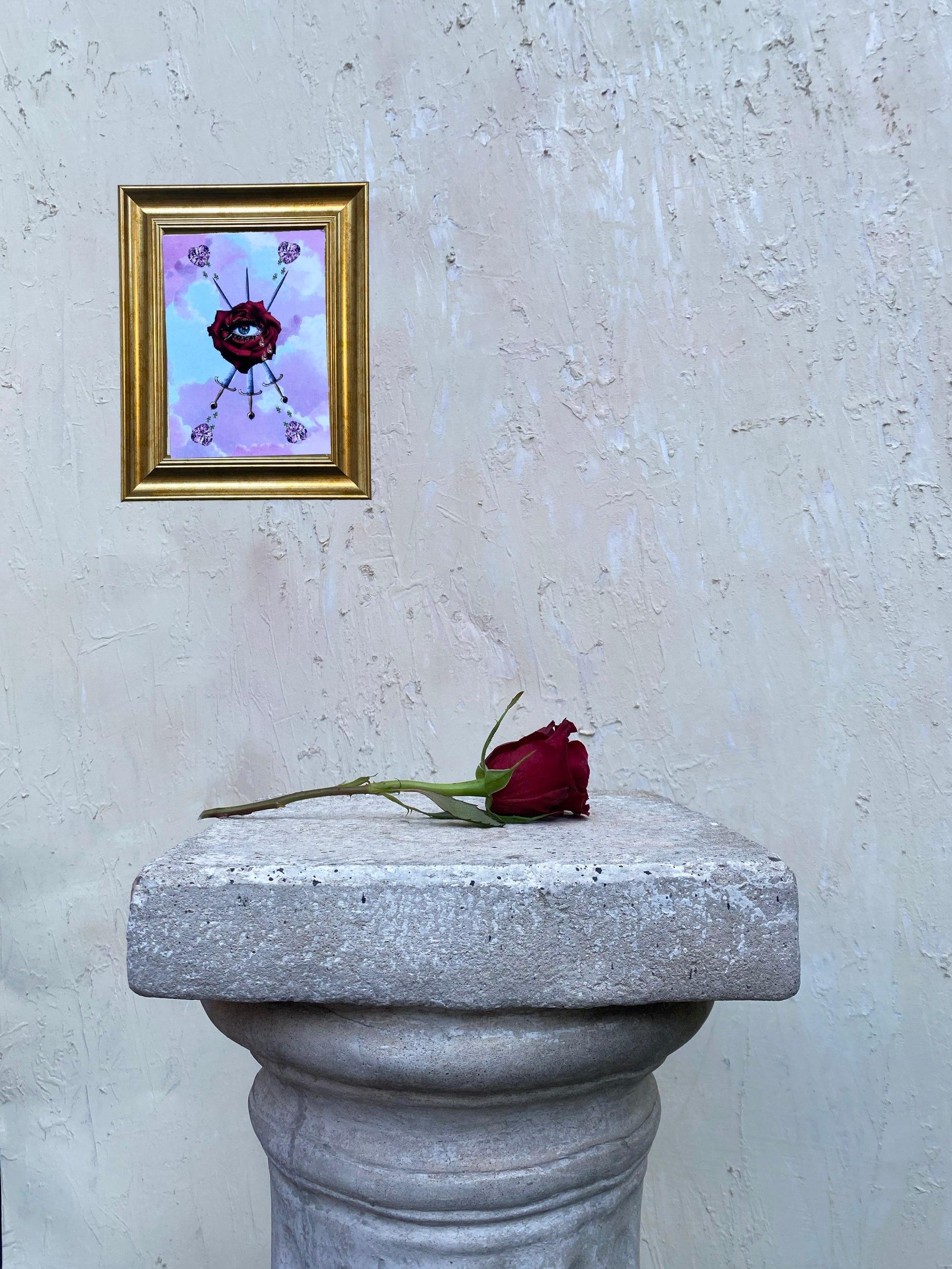 A limited edition print version of the Goddess of Love Tarot card, featuring a lover's eye and three swords.