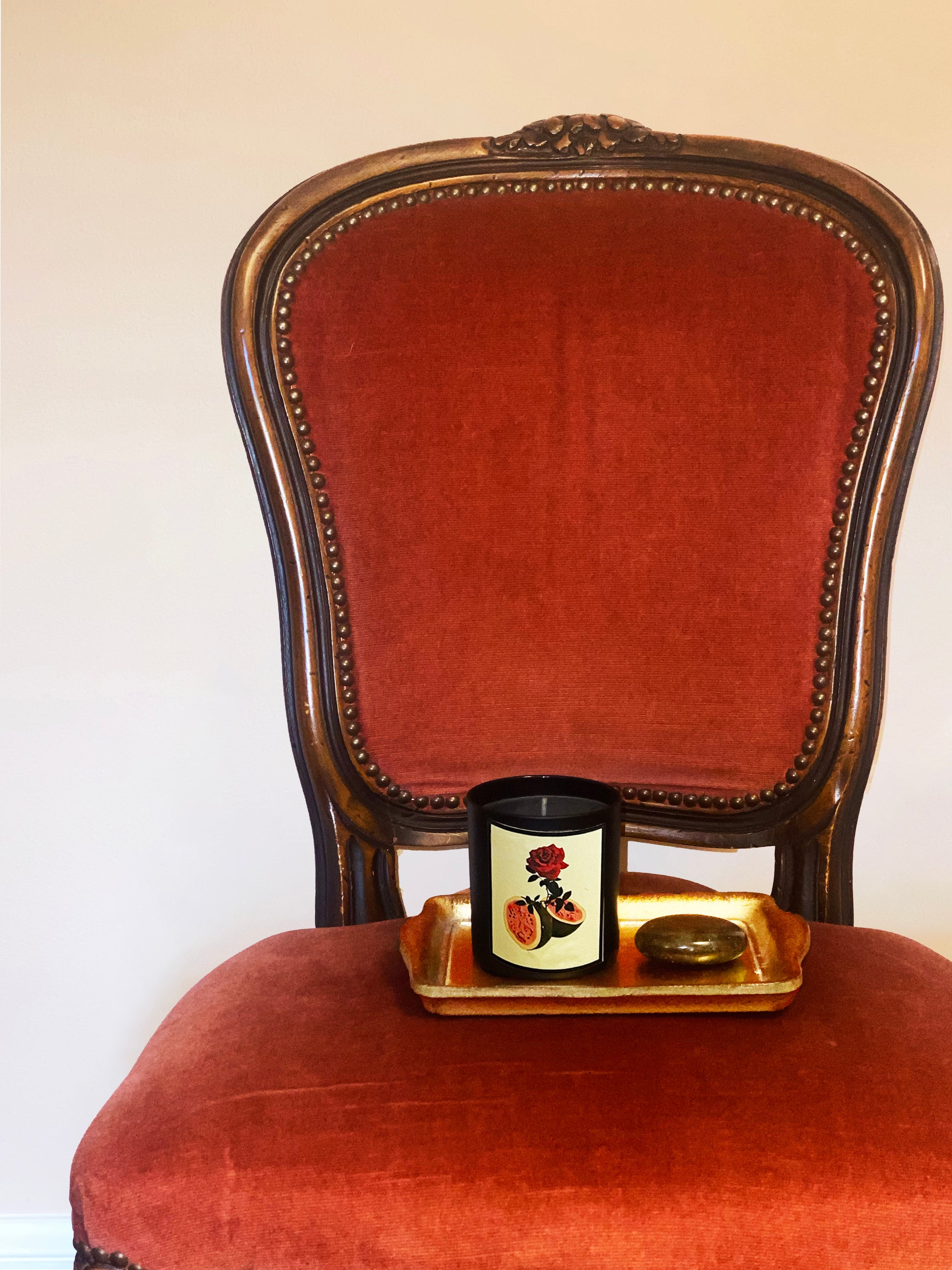 Scented in rose. Crafted from 100% black soy wax encased in an iridescent Egyptian glass jar. Has a 70-hour burn time.