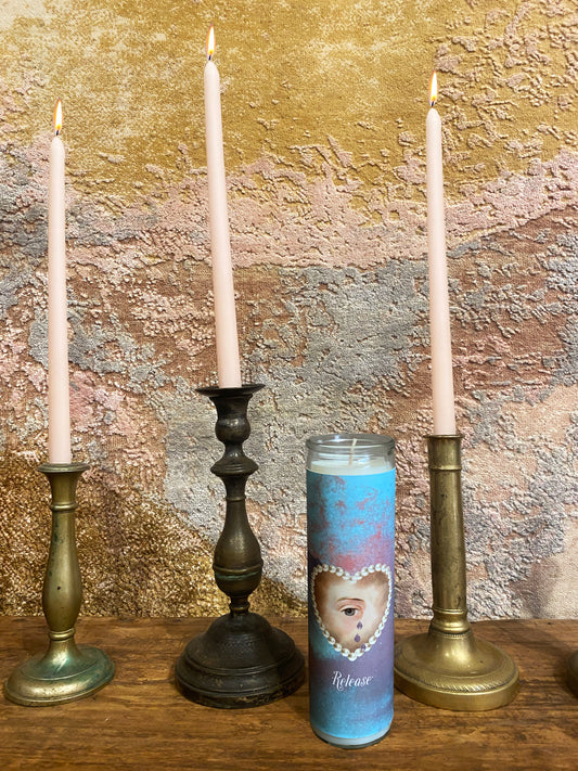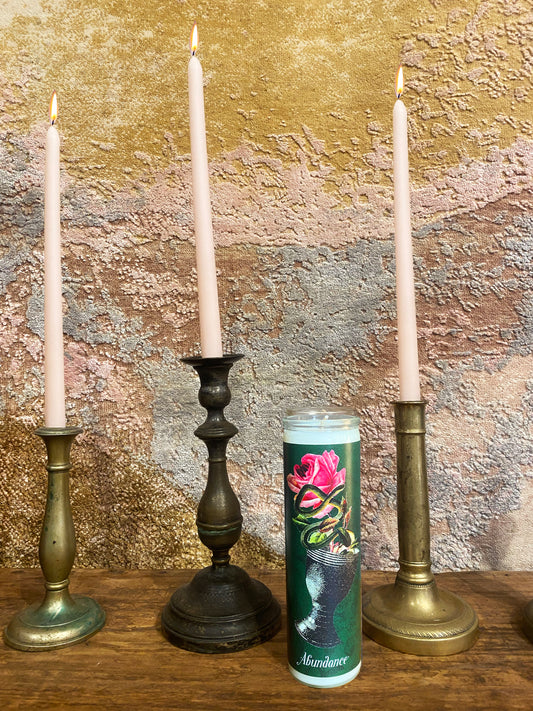 Snakes for Hair altar candles are designed in the traditions of folk magic, astrology and Tarot. A single, hand-cut collage takes many months to complete before going into limited production in a small Brooklyn studio. When you select a candle, you are choosing a work of art and instrument of magic. And it's here to help you realize your mission as a self-creator. Magic is reciprocal, so light with intention, tap into your highest vibration, and meditate on your wish. And remember-Snakes for Hair loves you.