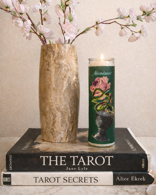 Snakes for Hair altar candles are designed in the traditions of folk magic, astrology and Tarot. A single, hand-cut collage takes many months to complete before going into limited production in a small Brooklyn studio. When you select a candle, you are choosing a work of art and instrument of magic. And it's here to help you realize your mission as a self-creator. Magic is reciprocal, so light with intention, tap into your highest vibration, and meditate on your wish. And remember-Snakes for Hair loves you.